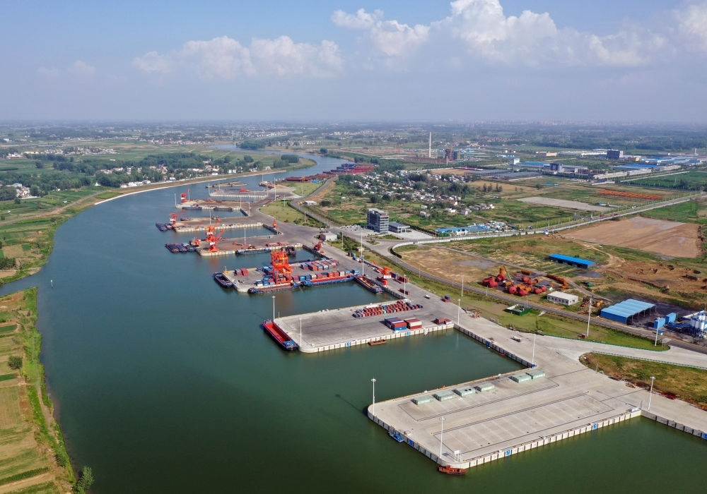 2022年6月28日拍攝的河南周口中心港碼頭(無人機(jī)照片)。近年來,河南積極推進(jìn)沙潁河航道升級改造,疏通內(nèi)河航運(yùn)?,F(xiàn)在,從周口中心港出發(fā)的船舶可經(jīng)沙潁河至淮河、京杭大運(yùn)河駛?cè)腴L江,讓內(nèi)陸城市亦能通江達(dá)海。