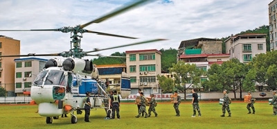 6月17日,廣東省梅州市平遠(yuǎn)縣體育場,直升機(jī)在運(yùn)送救援物資。馮錫權(quán)攝(人民視覺)