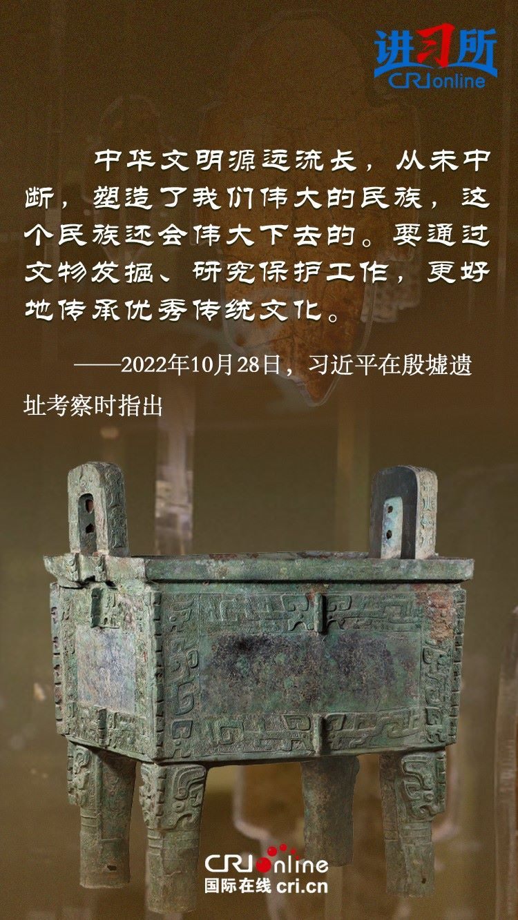 文物和文化遺產(chǎn)承載燦爛文明,傳承歷史文化,維系民族精神。三星堆博物館、殷墟遺址、敦煌研究院……這些年,習(xí)近平高度重視中華文明探源工程和文物保護工作,強調(diào)要把中華文明歷史引向深入,把中華優(yōu)秀傳統(tǒng)文化一代一代傳下去。