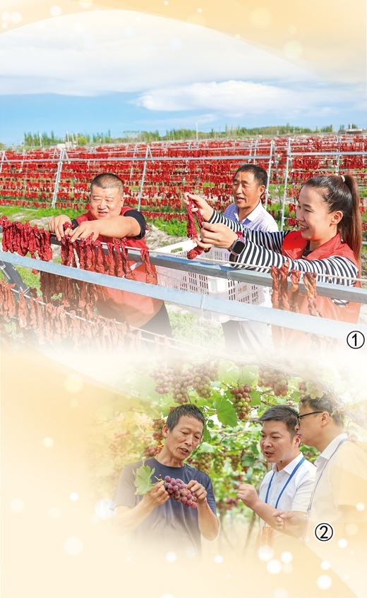 圖①:新疆維吾爾自治區(qū)博湖縣塔溫覺肯鄉(xiāng)辣椒曬場上,黨員志愿服務隊幫助村民晾曬辣椒。年 磊攝 圖②:浙江省淳安縣紀檢監(jiān)察干部走訪果農(nóng),聽取意見建議。謝航凱攝