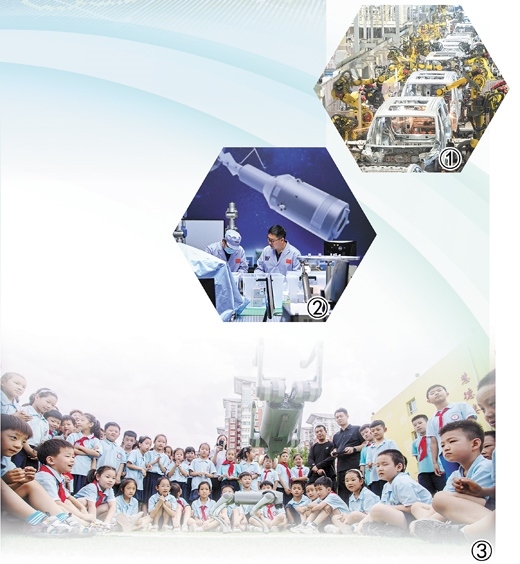 圖①:湖北武漢經(jīng)開區(qū)的嵐圖汽車電動(dòng)化焊裝車間,機(jī)器人正在流水線上作業(yè)。 新華社記者 肖藝九攝 圖②:中國科學(xué)院空間光學(xué)系統(tǒng)在軌制造與集成重點(diǎn)實(shí)驗(yàn)室的科研人員在進(jìn)行科研工作。 新華社記者 許 暢攝 圖③:河北邯鄲市復(fù)興區(qū)前進(jìn)小學(xué)的學(xué)生們?cè)谟^看機(jī)器狗表演。聶長青攝(人民視覺)