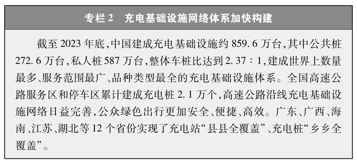 全方位構(gòu)建清潔高效的交通運輸體系。隨著經(jīng)濟社會發(fā)展,物流、出行需求不斷增加,交通用能還將持續(xù)增長。中國加快發(fā)展多式聯(lián)運,提高鐵路、水路在綜合運輸中的承運比重。深入推進城市公共交通優(yōu)先發(fā)展,構(gòu)建完善綠色出行服務(wù)體系,在城市客運領(lǐng)域推廣應(yīng)用新能源車輛。機動車排放標(biāo)準(zhǔn)與世界先進水平接軌,基本淘汰國三及以下排放標(biāo)準(zhǔn)汽車。運輸能耗強度不斷下降,2023年鐵路單位運輸工作量綜合能耗較2013年下降約19%。大力發(fā)展充電基礎(chǔ)設(shè)施網(wǎng)絡(luò),完善加氫、加氣站點布局及服務(wù)設(shè)施。截至2023年底,累計建成充電基礎(chǔ)設(shè)施近860萬臺,加氫站超過450座。