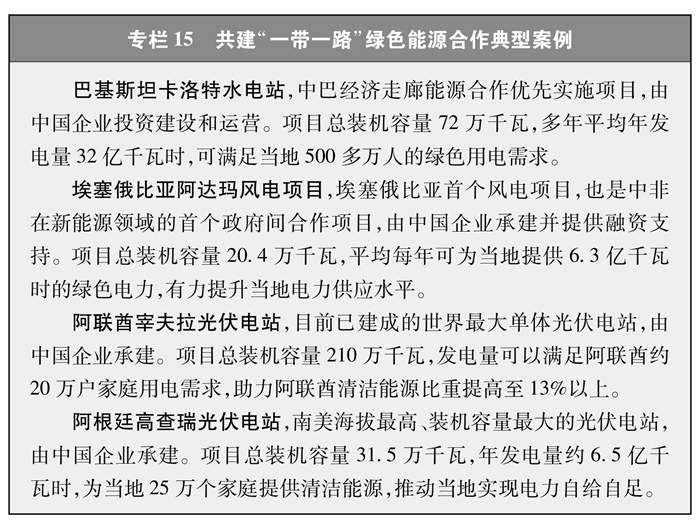 持續(xù)推動“一帶一路”綠色能源合作。中國發(fā)布《關(guān)于推進共建“一帶一路”綠色發(fā)展的意見》等政策文件,與共建“一帶一路”國家積極拓展綠色能源領(lǐng)域合作。2021年,中國宣布不再新建境外煤電項目,綠色低碳能源已成為中國在共建國家能源合作重點。中國與100多個國家和地區(qū)開展綠色能源項目合作,一大批標(biāo)志性能源項目和惠民生的“小而美”項目落地生根,有效解決了所在國用電難、用電貴等問題,為所在國提供了清潔、安全、可靠的能源供應(yīng)方案。