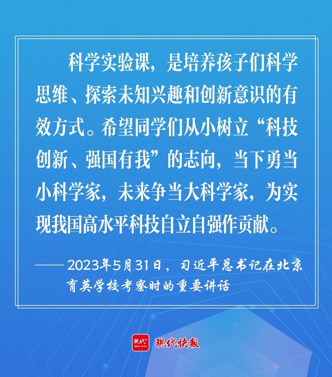 2023年5月,習(xí)近平總書記在北京育英學(xué)校考察時強(qiáng)調(diào),希望同學(xué)們從小樹立“科技創(chuàng)新、強(qiáng)國有我”的志向,當(dāng)下勇當(dāng)小科學(xué)家,未來爭當(dāng)大科學(xué)家,為實現(xiàn)我國高水平科技自立自強(qiáng)作貢獻(xiàn)。