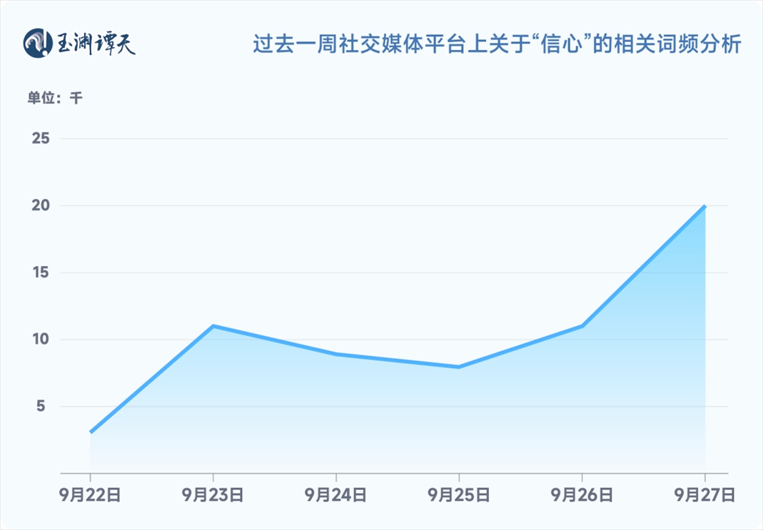 從這張曲線圖上可以看到,輿論場對“中國經(jīng)濟”的討論,在過去一周經(jīng)歷了2個峰值。其中,“信心”這個詞出現(xiàn)的頻率經(jīng)歷了兩次躍升。