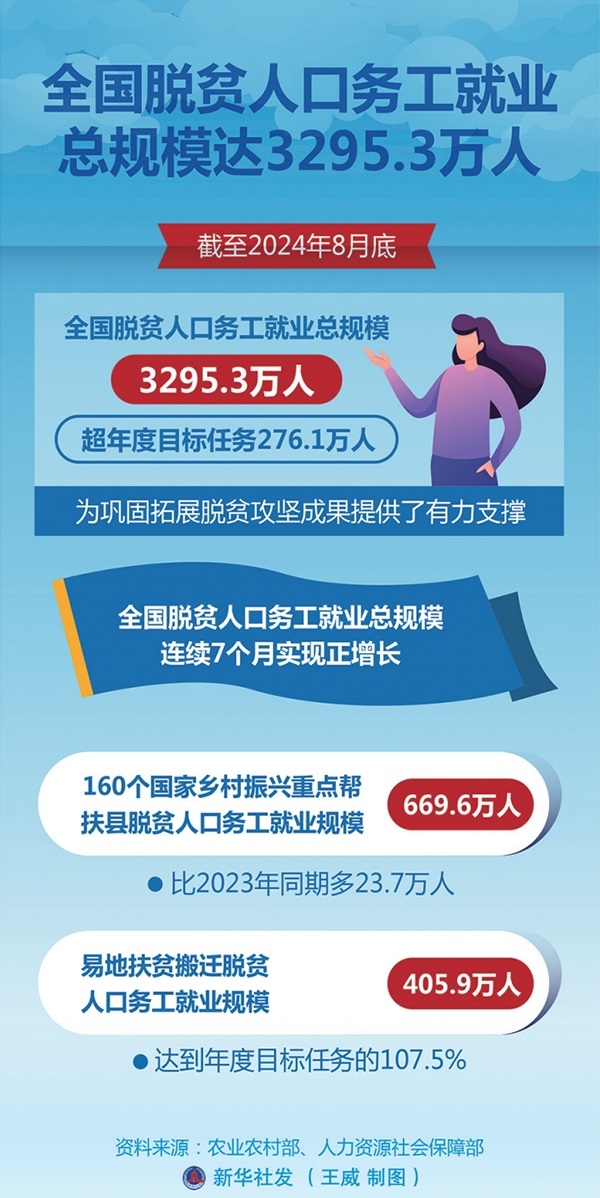 今年以來各級各相關(guān)部門深入開展防止返貧就業(yè)攻堅行動,截至8月底,全國脫貧人口務(wù)工就業(yè)總規(guī)模達到3295.3萬人,超年度目標任務(wù)276.1萬人,為鞏固拓展脫貧攻堅成果提供了有力支撐。 新華社發(fā) 王威/制圖