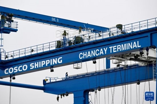 這是6月21日在秘魯錢(qián)凱港拍攝的印有“中遠(yuǎn)海運(yùn),錢(qián)凱碼頭”字樣的軌道吊。 新華社記者 李木子 攝