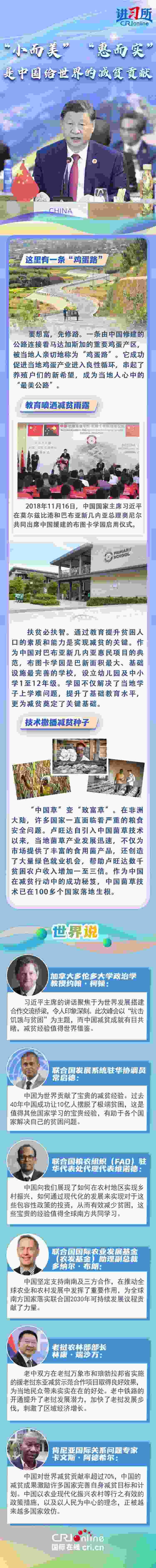 “世界繁榮穩(wěn)定不可能建立在貧者愈貧、富者愈富的基礎(chǔ)之上。”近年來(lái),中國(guó)一直在用實(shí)際行動(dòng)與世界分享脫貧經(jīng)驗(yàn):與東盟國(guó)家共同開(kāi)展鄉(xiāng)村減貧推進(jìn)計(jì)劃,在非洲開(kāi)展基礎(chǔ)設(shè)施建設(shè)和農(nóng)業(yè)、醫(yī)療等技術(shù)合作援助項(xiàng)目,在拉美援建農(nóng)業(yè)技術(shù)中心......一批批“小而美”“惠而實(shí)”的民生項(xiàng)目落地生根,幫助當(dāng)?shù)孛癖姅[脫貧困。多國(guó)人士表示,中國(guó)成功打贏脫貧攻堅(jiān)戰(zhàn)具有世界意義,不僅為發(fā)展中國(guó)家提供了借鑒經(jīng)驗(yàn),更有助于推動(dòng)建設(shè)一個(gè)共同發(fā)展的公正世界。