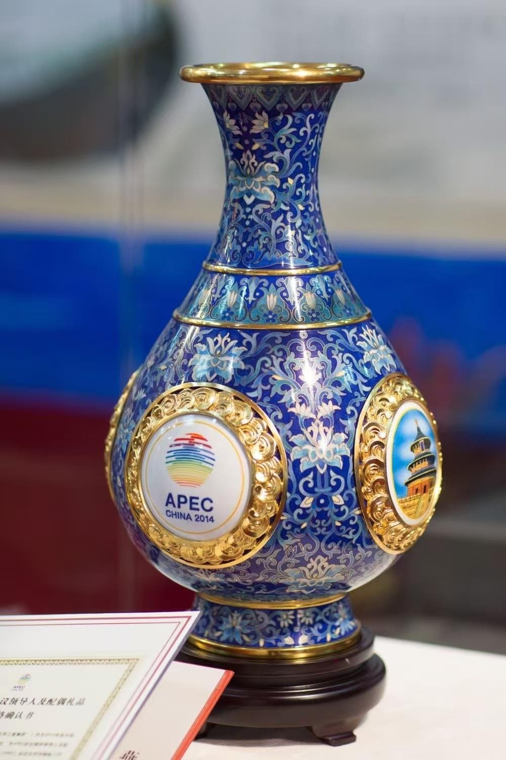 2014年11月,北京APEC會議在雁棲湖畔舉行。為歡迎參會的各經(jīng)濟(jì)體領(lǐng)導(dǎo)人,習(xí)近平主席選定了一件國禮——“四海升平”景泰藍(lán)賞瓶。賞瓶的細(xì)節(jié)蘊(yùn)含巧思:瓶高38厘米,是天壇祈年殿38米的等比例縮?。蛔畲笾睆?1厘米,代表APEC的21個(gè)經(jīng)濟(jì)體。碧藍(lán)的瓶身雕著水紋,既象征“四?!币泊憝h(huán)太平洋?!捌俊笔恰捌健钡闹C音,連起來即“四海升平”。