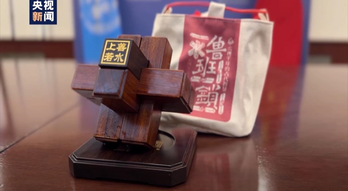 六根棕色木條相互巧妙鎖定,構(gòu)成一個(gè)穩(wěn)定的整體。這是中國擔(dān)任2023年11月聯(lián)合國安理會輪值主席首日向安理會成員贈送的禮品——魯班鎖。