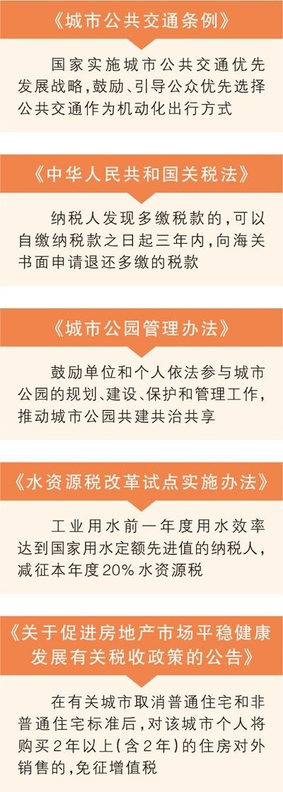編者按:鼓勵(lì)、引導(dǎo)公眾優(yōu)先選擇公共交通作為機(jī)動(dòng)化出行方式;保持現(xiàn)行關(guān)稅稅制基本穩(wěn)定;鼓勵(lì)單位和個(gè)人參與城市公園的規(guī)劃、建設(shè)、管理……12月起,《城市公共交通條例》《中華人民共和國關(guān)稅法》《城市公園管理辦法》等一批法律法規(guī)正式施行,切實(shí)以法治力量推動(dòng)經(jīng)濟(jì)社會(huì)高質(zhì)量發(fā)展。