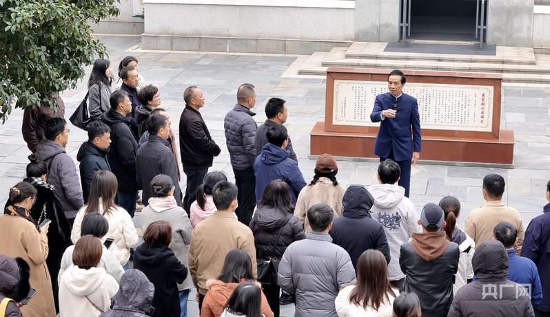 胡昇正在給游客講解青山生態(tài)蝶變的故事(央廣網(wǎng)見(jiàn)習(xí)記者鄧子依 攝)