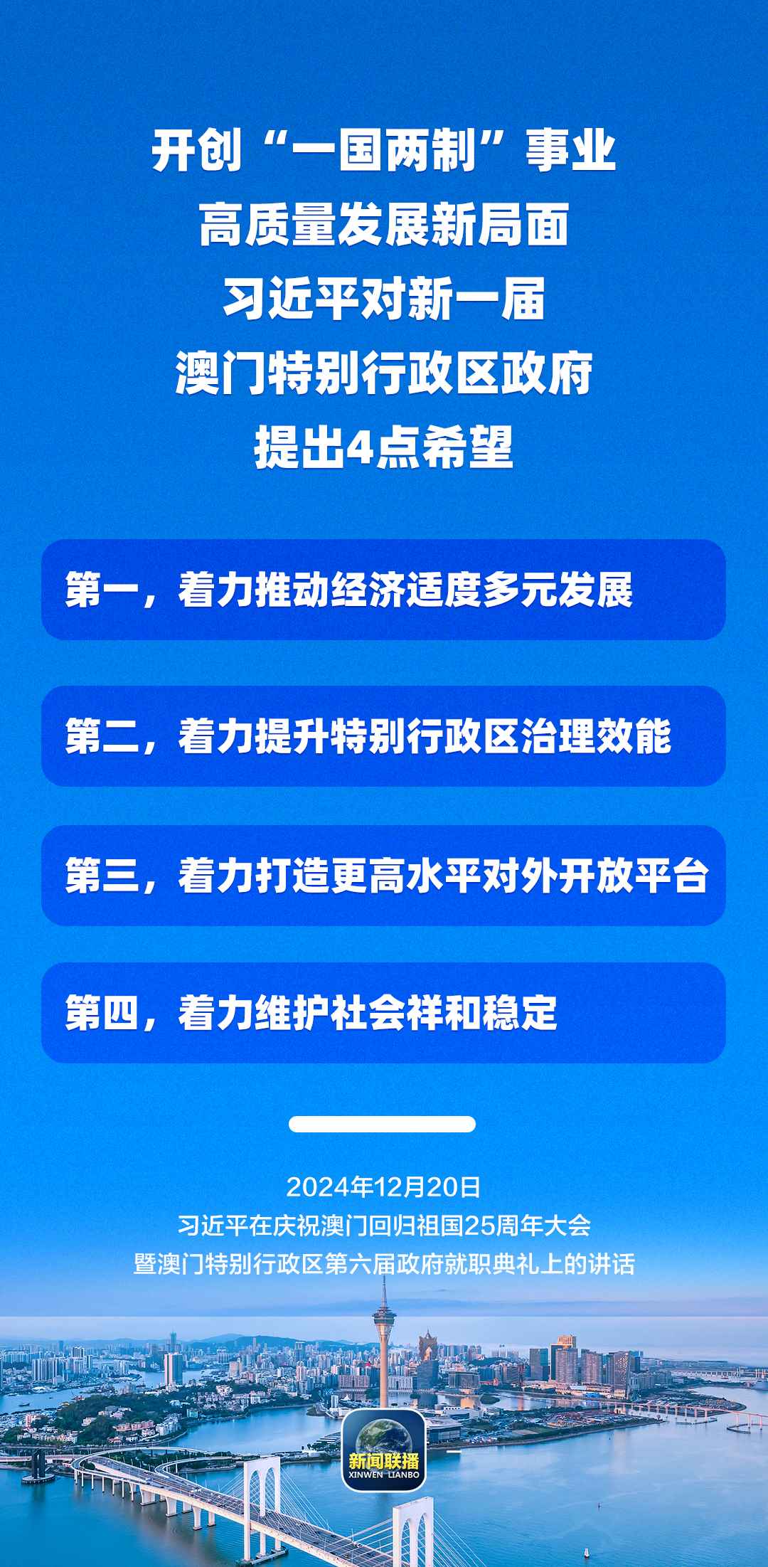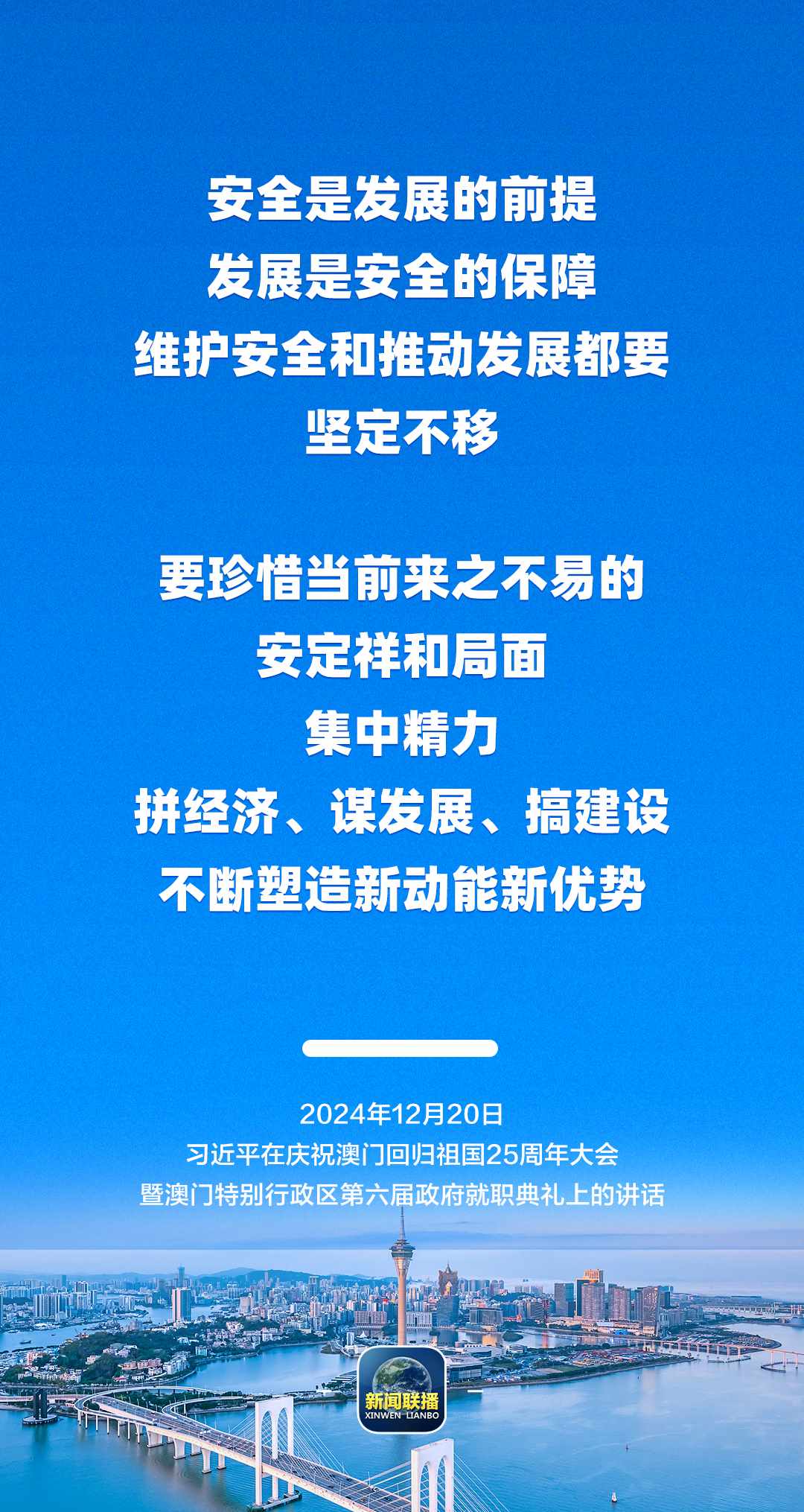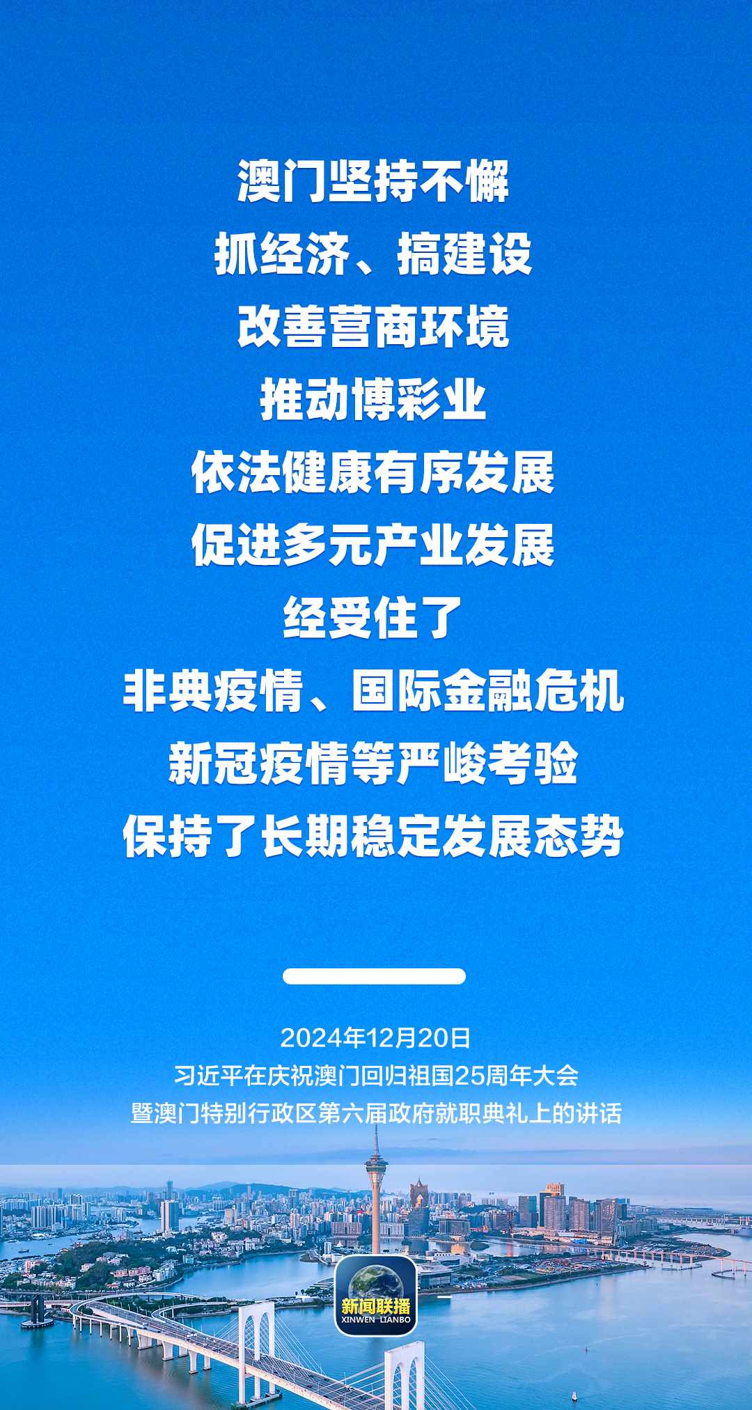 習近平強調,只要全面準確、堅定不移貫徹“一國兩制”方針,有特別行政區(qū)政府和社會各界共同努力,有偉大祖國作堅強后盾,澳門一定能打開發(fā)展新天地、不斷創(chuàng)造新輝煌,一定能為以中國式現(xiàn)代化全面推進強國建設、民族復興偉業(yè)作出更大貢獻。