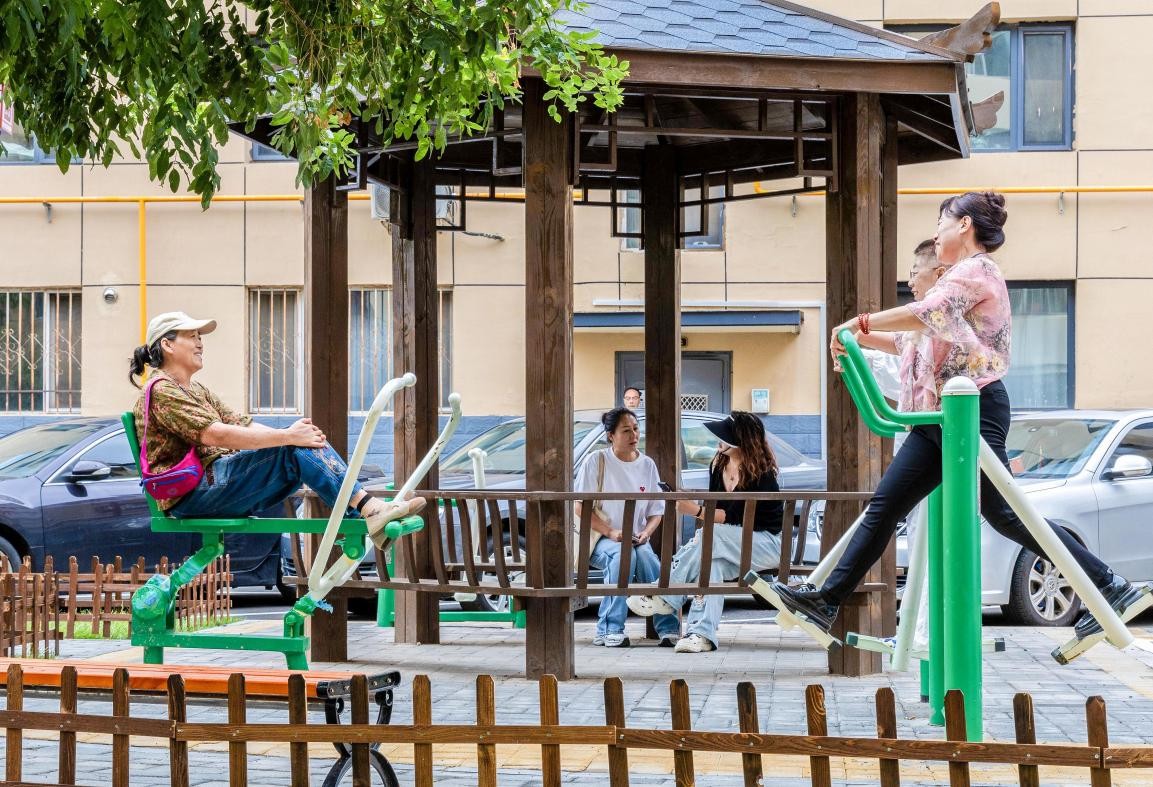 2024年8月26日,內(nèi)蒙古呼和浩特市玉泉區(qū)綠緣小區(qū),居民在改造后的運(yùn)動(dòng)休閑區(qū)健身。