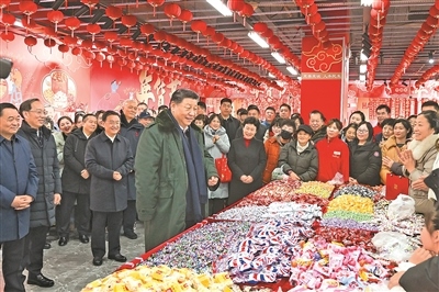 沈陽(yáng)大東副食品商場(chǎng)歷史悠久,富有特色的年節(jié)商品琳瑯滿目。23日上午,習(xí)近平來(lái)到這里,察看多家店鋪,頻頻同店主和顧客交流,詳細(xì)了解節(jié)日期間市場(chǎng)供應(yīng)情況。大家見到總書記都十分激動(dòng),連聲歡呼“總書記好”!習(xí)近平對(duì)大家說(shuō),“菜籃子”、“米袋子”、“果盤子”是民生大事,現(xiàn)在物質(zhì)豐裕,過(guò)年團(tuán)圓更要讓大家吃得好、吃得健康。