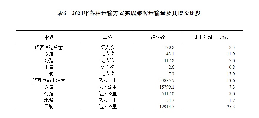 [29]自2024年1月起,公路旅客運輸量、公路旅客運輸周轉量統(tǒng)計口徑進行了調整,將班車包車客運量、公共汽電車城際城鄉(xiāng)客運量、出租汽車(含巡游出租汽車、網絡預約出租汽車)城際城鄉(xiāng)客運量納入公路旅客運輸量統(tǒng)計,公路旅客運輸周轉量統(tǒng)計口徑相應調整。2024年旅客運輸總量、旅客運輸周轉量、公路旅客運輸量、公路旅客運輸周轉量增速按可比口徑計算。