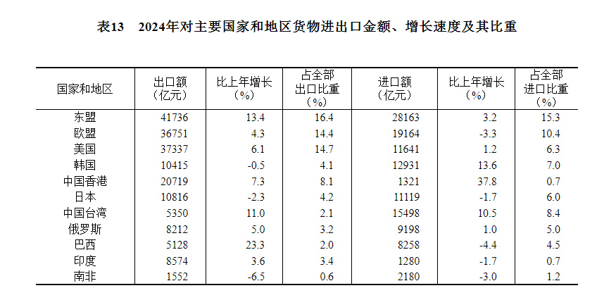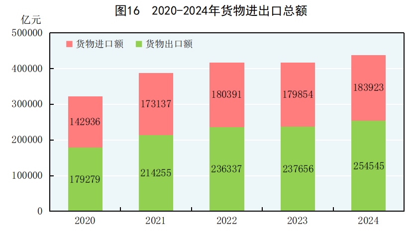 全年貨物進出口總額438468億元,比上年增長5.0%。其中,出口254545億元,增長7.1%;進口183923億元,增長2.3%。貨物進出口順差70623億元。對共建“一帶一路”[50]國家進出口額220685億元,比上年增長6.4%。其中,出口122095億元,增長9.6%;進口98589億元,增長2.7%。對《區(qū)域全面經濟伙伴關系協(xié)定》(RCEP)其他成員國[51]進出口額131645億元,比上年增長4.5%。民營企業(yè)進出口額243329億元,比上年增長8.8%,占進出口總額比重為55.5%;其中出口164717億元,增長9.4%。