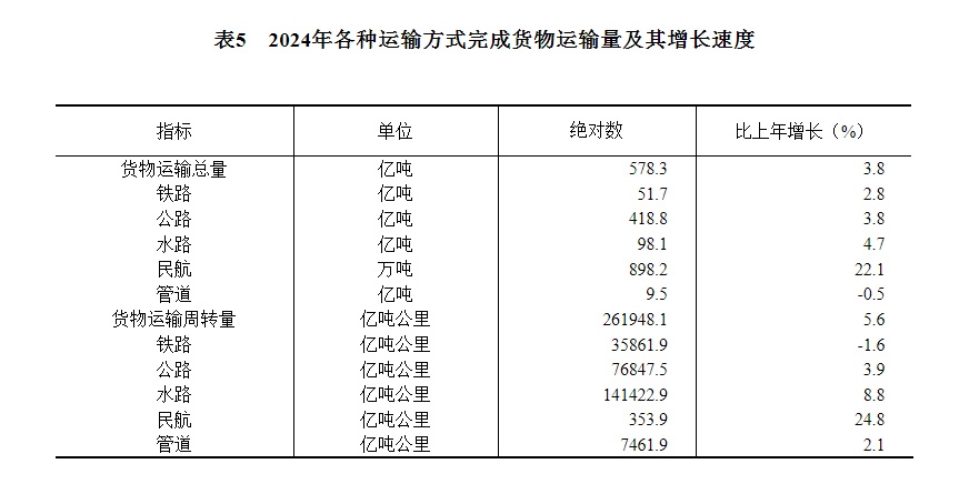 [28]貨物運輸總量及周轉量包括鐵路、公路、水路、民航和管道五種運輸方式完成量,2024年增速按可比口徑計算。