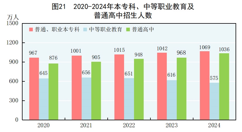 全年研究生教育招生135.7萬人,在學研究生409.5萬人,畢業(yè)生108.4萬人。普通、職業(yè)本??芠74]招生1068.9萬人,在校生3891.3萬人,畢業(yè)生1059.4萬人。中等職業(yè)教育[75]招生575.4萬人,在校生1659.4萬人,畢業(yè)生542.2萬人。普通高中招生1036.2萬人,在校生2922.3萬人,畢業(yè)生891.0萬人。初中招生1848.8萬人,在校生5386.2萬人,畢業(yè)生1698.2萬人。普通小學招生1616.6萬人,在校生10584.4萬人,畢業(yè)生1857.3萬人。特殊教育招生15.8萬人,在校生91.6萬人,畢業(yè)生17.7萬人。學前教育在園幼兒3584.0萬人。九年義務教育鞏固率為95.9%,高中階段毛入學率為92.0%。