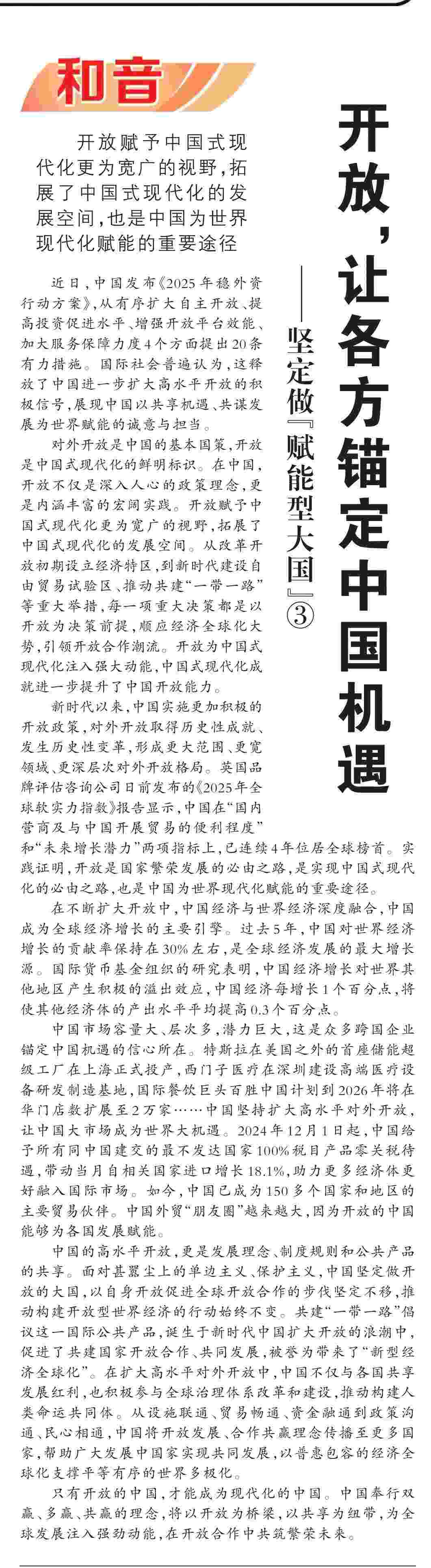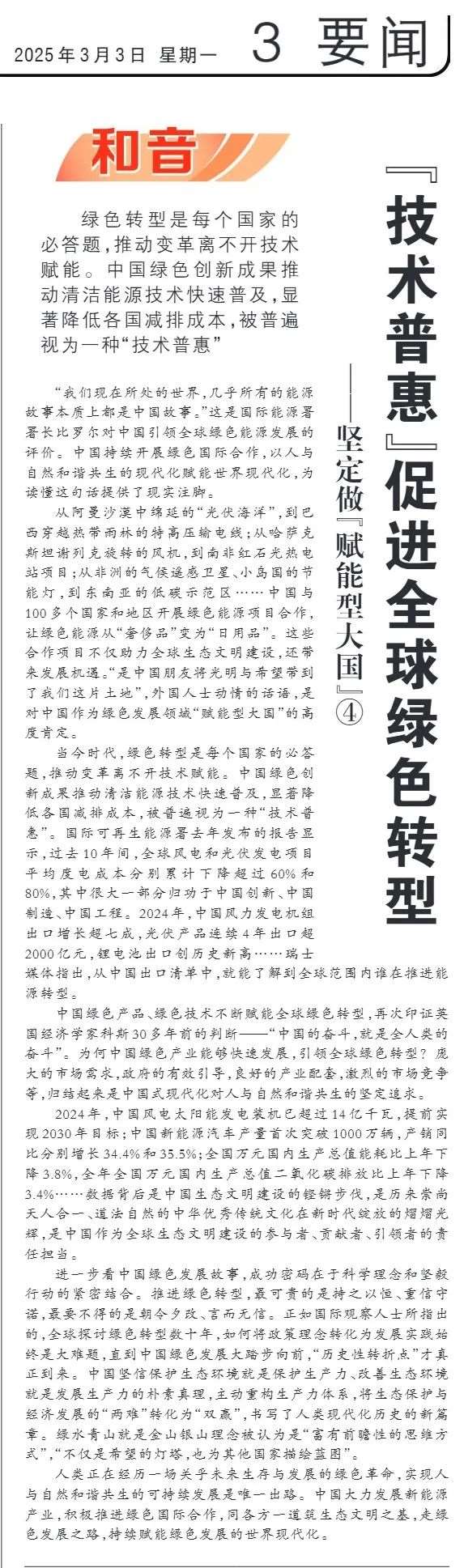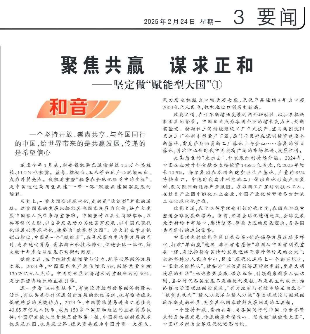 近期,《人民日報》“和音”欄目推出“堅定做‘賦能型大國’”系列評論,圍繞科技創(chuàng)新、開放共贏、綠色轉型、高質量共建“一帶一路”、多邊治理等熱點議題,從不同角度闡釋中國何以成為一個“賦能型大國”的深層邏輯,展現(xiàn)中國始終秉持構建人類命運共同體理念,不斷以中國式現(xiàn)代化為世界現(xiàn)代化賦能的大國擔當。