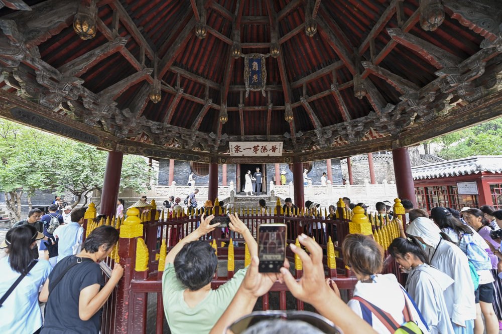 位于太原的晉祠,是祭祀西周初晉國(guó)首任諸侯唐叔虞的祠堂,是集中國(guó)古代祠祀建筑、園林、雕塑、壁畫、碑刻藝術(shù)于一體的珍貴的千年古祠,是首批全國(guó)重點(diǎn)文物保護(hù)單位之一。這是2024年7月25日,游客在晉祠博物館參觀。