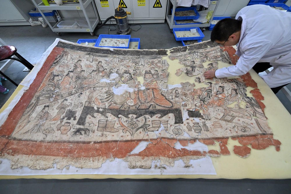 2024年2月27日,云岡研究院壁畫文物修復(fù)室工作人員王建國(guó)在修復(fù)壁畫。