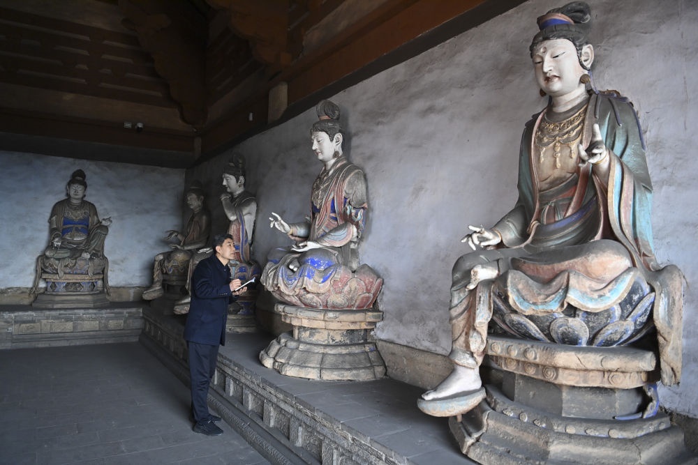 2024年3月16日,在山西長(zhǎng)子縣法興寺圓覺殿,天王寺法興寺崇慶寺文物所副所長(zhǎng)張宇飛記錄宋代彩塑的保存狀況。張宇飛從1993年開始擔(dān)任法興寺文保員,在日常講解之余,他通過查閱史料、研讀碑文、請(qǐng)教專家、走訪鄉(xiāng)民等方式,挖掘文物背后的故事,通過自媒體發(fā)表介紹山西文化遺產(chǎn)的原創(chuàng)文章百余篇。