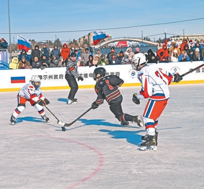 2月22日至23日,2025中俄國際冬季體育系列比賽在中國黑河市和俄羅斯布拉戈維申斯克市之間的黑龍江江面上舉行。圖為中俄少年組冰球隊員在賽場上激烈角逐。