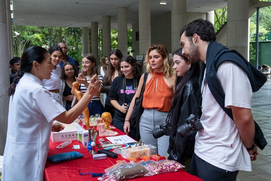 2025年4月15日,在巴西里約熱內(nèi)盧天主教大學(xué)舉辦的“國際中文日”慶祝活動(dòng)上,學(xué)生們觀看中醫(yī)療法展示。新華社記者 王天聰 攝