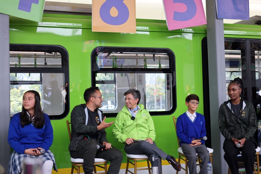 2023年8月10日,哥倫比亞波哥大市長克勞迪婭·洛佩斯(中)在波哥大地鐵的模型車廂旁跟參加活動(dòng)的師生交流。按照計(jì)劃,由中企承建和運(yùn)營的波哥大地鐵一號(hào)線將在2028年正式投入運(yùn)營。新華社記者 周盛平 攝