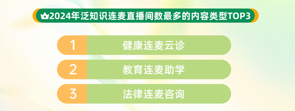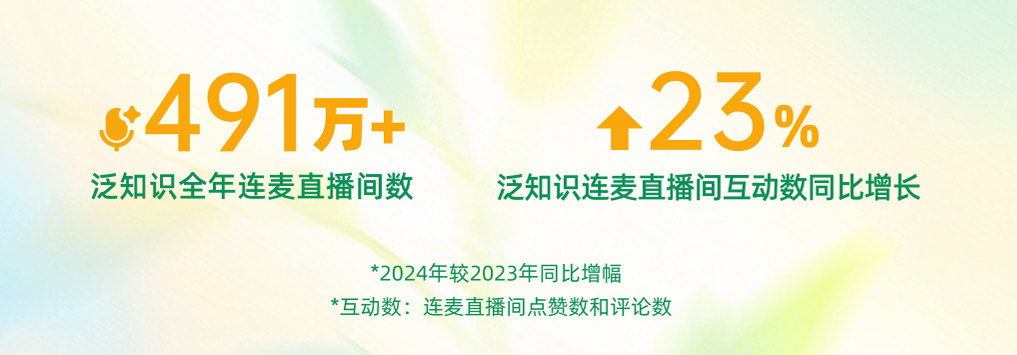 隨著用戶互動與創(chuàng)作者投稿形成正向循環(huán),推動生態(tài)雙向繁榮,連麥學(xué)習(xí)正重塑知識普惠的全新范式。數(shù)據(jù)顯示,2024年,快手泛知識連麥直播場次達491萬場,直播間互動量同比提升23%,健康咨詢、教育助學(xué)、法律咨詢位列連麥內(nèi)容前三。