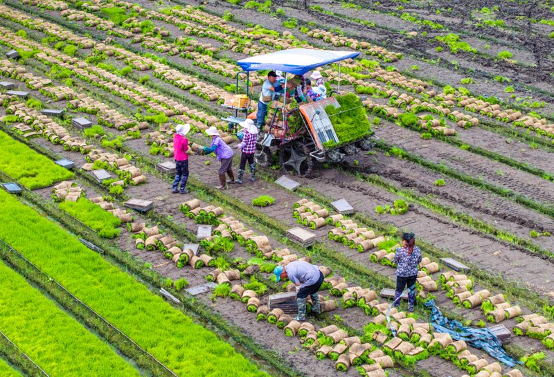 6月14日,在江蘇里下河地區(qū)農(nóng)科所(揚(yáng)州市農(nóng)科院),農(nóng)民在田里起秧、運(yùn)秧(無人機(jī)照片)。