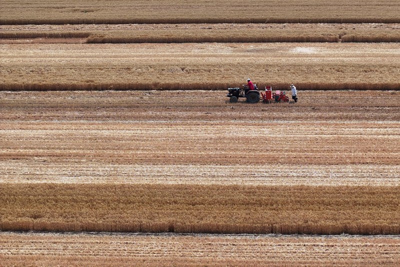 6月10日,在山東省聊城市茌平區(qū)博平鎮(zhèn)任何村,農(nóng)民駕駛農(nóng)機(jī)播種玉米(無人機(jī)照片)。
