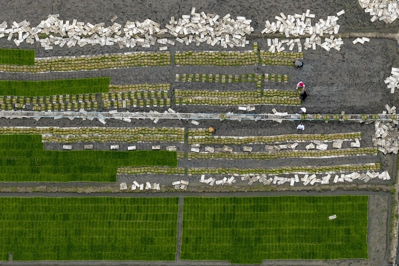 6月18日,在江蘇省海安市墩頭鎮(zhèn)千步村,農(nóng)民起水稻秧苗,準(zhǔn)備進(jìn)行水稻機(jī)插(無人機(jī)照片)。