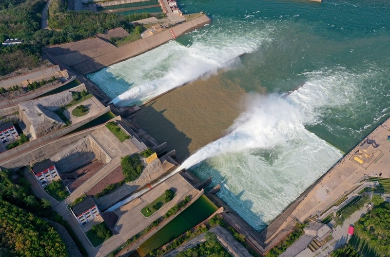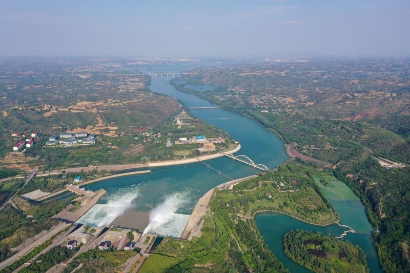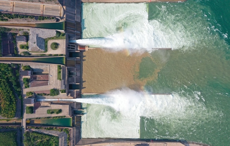 6月23日,游客在小浪底水利樞紐工程出水口觀看調(diào)水調(diào)沙(無(wú)人機(jī)照片)。