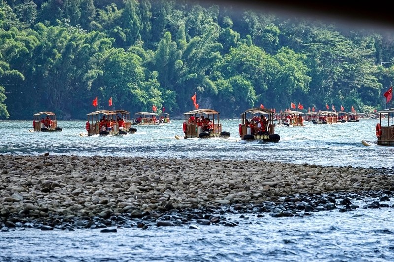 9月13日,在廣西桂林市陽朔縣興坪鎮(zhèn),游人在漓江上乘坐竹筏賞景。