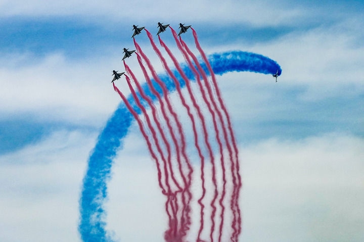 10時(shí)許,空軍航空大學(xué)“紅鷹”飛行表演隊(duì)采取雙四機(jī)超密集編隊(duì)起飛,拉開飛行表演序幕。8架紅白藍(lán)涂裝的教-8飛機(jī)完成機(jī)群集合后,以經(jīng)典的“紅鷹”編隊(duì)動(dòng)作通場(chǎng),八機(jī)鉆石斤斗、六機(jī)快滾、雙機(jī)點(diǎn)贊、單機(jī)盤旋繞軸、七機(jī)開花等19個(gè)動(dòng)作高水平呈現(xiàn)。