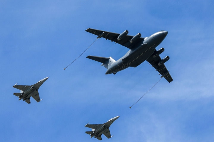↑9月19日,運(yùn)油-20A和殲-16編隊(duì)通場(chǎng)。新華社記者 顏麟蘊(yùn) 攝