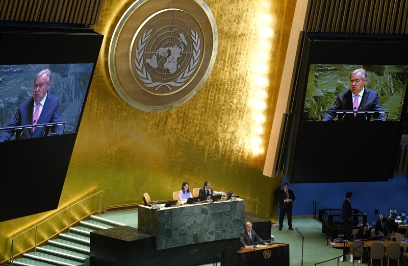 9月22日,在位于紐約的聯(lián)合國總部,聯(lián)合國秘書長古特雷斯在紀(jì)念北京世婦會30周年高級別會議上講話。
