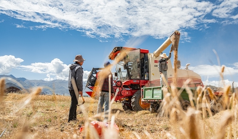 9月23日,在西藏拉薩市林周縣松盤鄉(xiāng)崗巴村,農民用收割機收獲青稞。