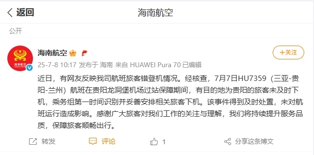 據(jù)海南航空官方微博消息,近日,有網(wǎng)友反映海南航空航班旅客錯登機情況。經(jīng)核查,7月7日HU7359(三亞-貴陽-蘭州)航班在貴陽龍洞堡機場過站保障期間,有目的地為貴陽的旅客未及時下機,乘務(wù)組第一時間識別并妥善安排相關(guān)旅客下機。該事件得到及時處置,未對航班運行造成影響。