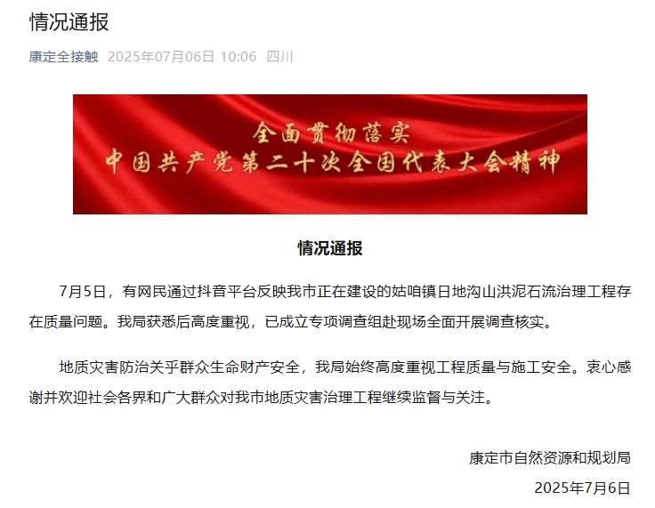 中新網(wǎng)7月6日電 據(jù)“康定全接觸”微信公眾號消息,7月5日,有網(wǎng)民通過抖音平臺反映四川省康定市正在建設的姑咱鎮(zhèn)日地溝山洪泥石流治理工程存在質(zhì)量問題??刀ㄊ凶匀毁Y源和規(guī)劃局獲悉后高度重視,已成立專項調(diào)查組赴現(xiàn)場全面開展調(diào)查核實。
