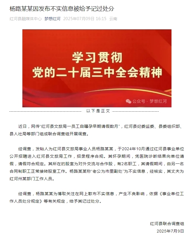 經調查,發(fā)帖人為紅河縣文旅局事業(yè)人員楊路某某,于2024年10月通過紅河縣事業(yè)單位公開招聘進入紅河縣文旅局工作,招錄程序合規(guī)。其懷孕期間,憑醫(yī)院診斷結果向單位請假,請假符合規(guī)定。其所在的股室為對外交流與合作股,有2名職工,其請假期間,由另一名合同制職工正常接轉股室工作。楊路某某稱“老公為市里副處”為不實信息,經核實,其丈夫為紅河州某部門工作人員。