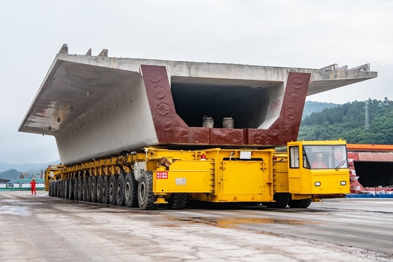 7月10日,在西渝高鐵陳家溝特大橋附近的制梁場,運(yùn)梁機(jī)在進(jìn)行箱梁轉(zhuǎn)運(yùn)作業(yè)。