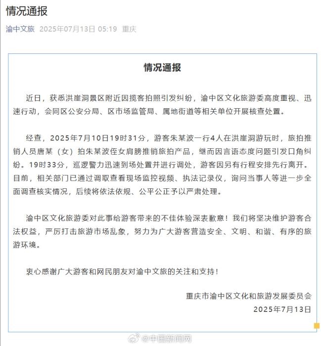 對上述事件,13日重慶渝中區(qū)文旅委致歉,相關(guān)部門已通過調(diào)取查看現(xiàn)場監(jiān)控視頻、執(zhí)法記錄儀,詢問當(dāng)事人等進(jìn)一步全面調(diào)查核實情況,后續(xù)將依法依規(guī)、公平公正予以嚴(yán)肅處理。