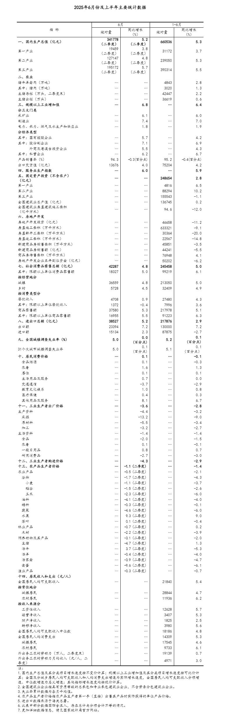 初步核算,上半年國內(nèi)生產(chǎn)總值660536億元,按不變價格計算,同比增長5.3%。分產(chǎn)業(yè)看,第一產(chǎn)業(yè)增加值31172億元,同比增長3.7%;第二產(chǎn)業(yè)增加值239050億元,增長5.3%;第三產(chǎn)業(yè)增加值390314億元,增長5.5%。分季度看,一季度國內(nèi)生產(chǎn)總值同比增長5.4%,二季度增長5.2%。從環(huán)比看,二季度國內(nèi)生產(chǎn)總值增長1.1%。