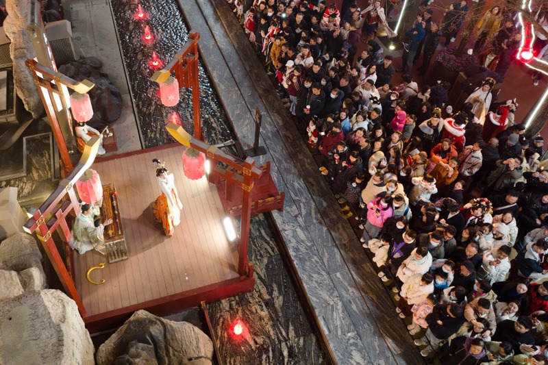 游客在西安大唐不夜城街區(qū)觀看以唐代歷史文化為背景創(chuàng)作的情景劇(1月22日攝,無人機照片)。