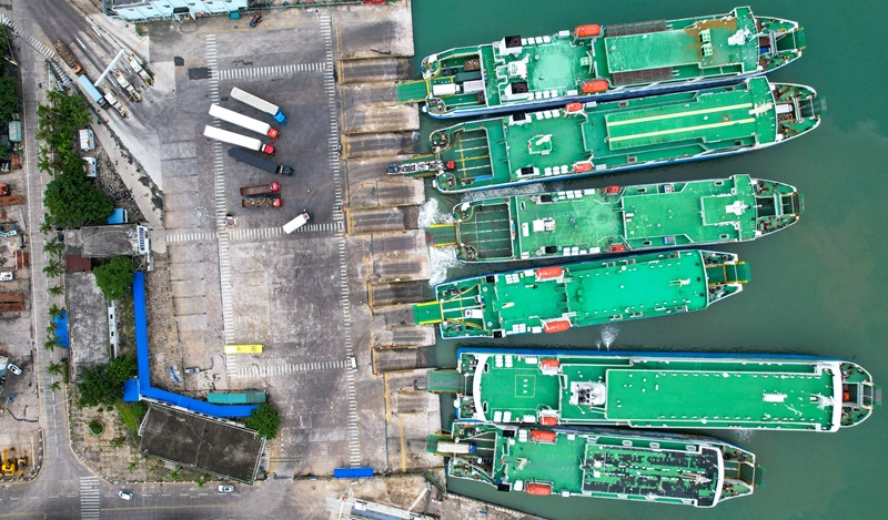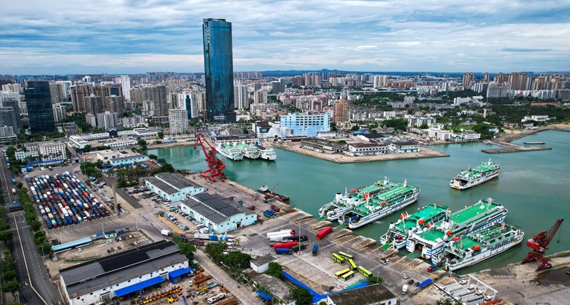 7月22日,裝載完成后的客滾船駛離??谑行阌⒏郏o(wú)人機(jī)照片)。
