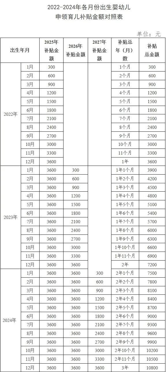 其中,對(duì)2025年1月1日之前出生、不滿3周歲的嬰幼兒,按應(yīng)補(bǔ)貼月數(shù)折算計(jì)發(fā)補(bǔ)貼。也就是說(shuō),2022年1月1日以后出生的符合條件的嬰幼兒,都可以領(lǐng)取育兒補(bǔ)貼。