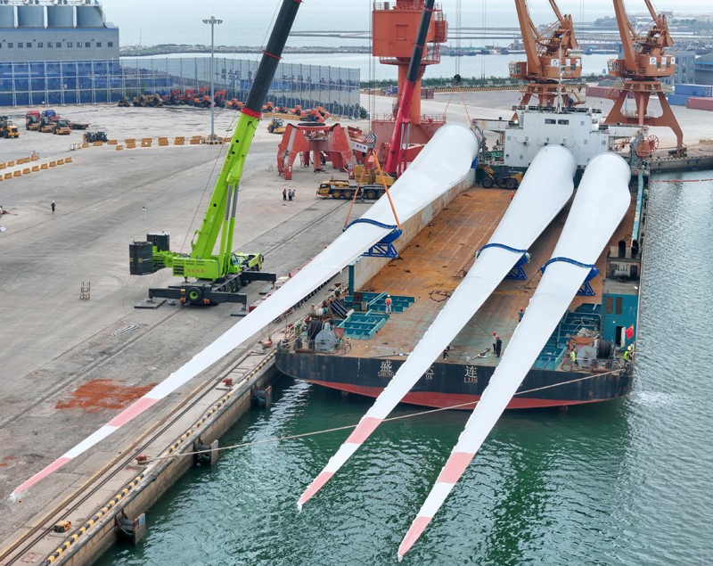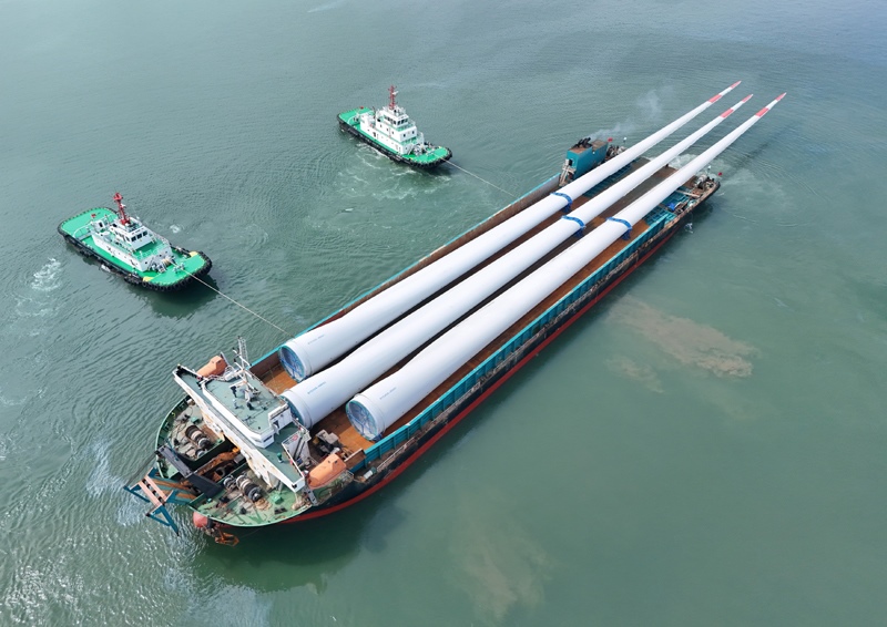 8月1日,三支超大尺寸海上風(fēng)力發(fā)電機(jī)試驗(yàn)葉片在山東港口煙臺(tái)港蓬萊港區(qū)完成裝船并運(yùn)往試驗(yàn)基地。該型葉片長(zhǎng)達(dá)153米,重83.5噸,屬于150米級(jí)超大尺寸海上風(fēng)電葉片,現(xiàn)已完成全部靜力測(cè)試,即將在試驗(yàn)基地進(jìn)行疲勞測(cè)試驗(yàn)證。